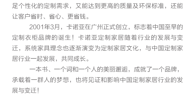 我們致力于打造專業、信賴的定制家居品牌,用卡諾亞人的不斷努力,讓家因我們而無限美好!
