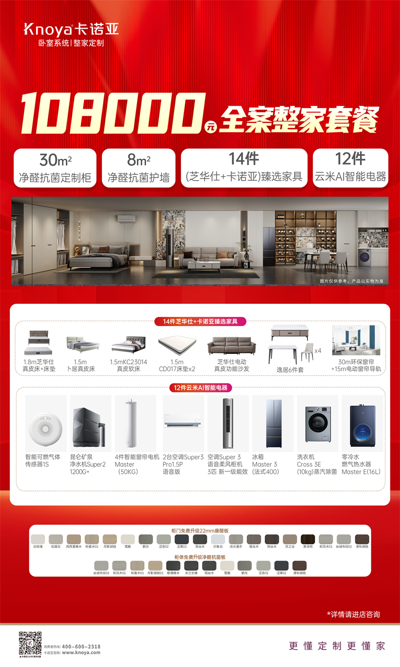 快節奏生活當下,繁瑣家裝流程讓人望而卻步??ㄖZ亞全案整家套餐應運而生,聚焦消費者對全屋空間的智能化、品質化需求,提供“高配、滿配、全配”的一站式省心定制解決方案,重新定義品質家裝——從定制柜、家具到家電等品類產品,從設計、施工到售后一站式閉環,規避風格混亂與工期延誤,真正實現“拎包即住”。